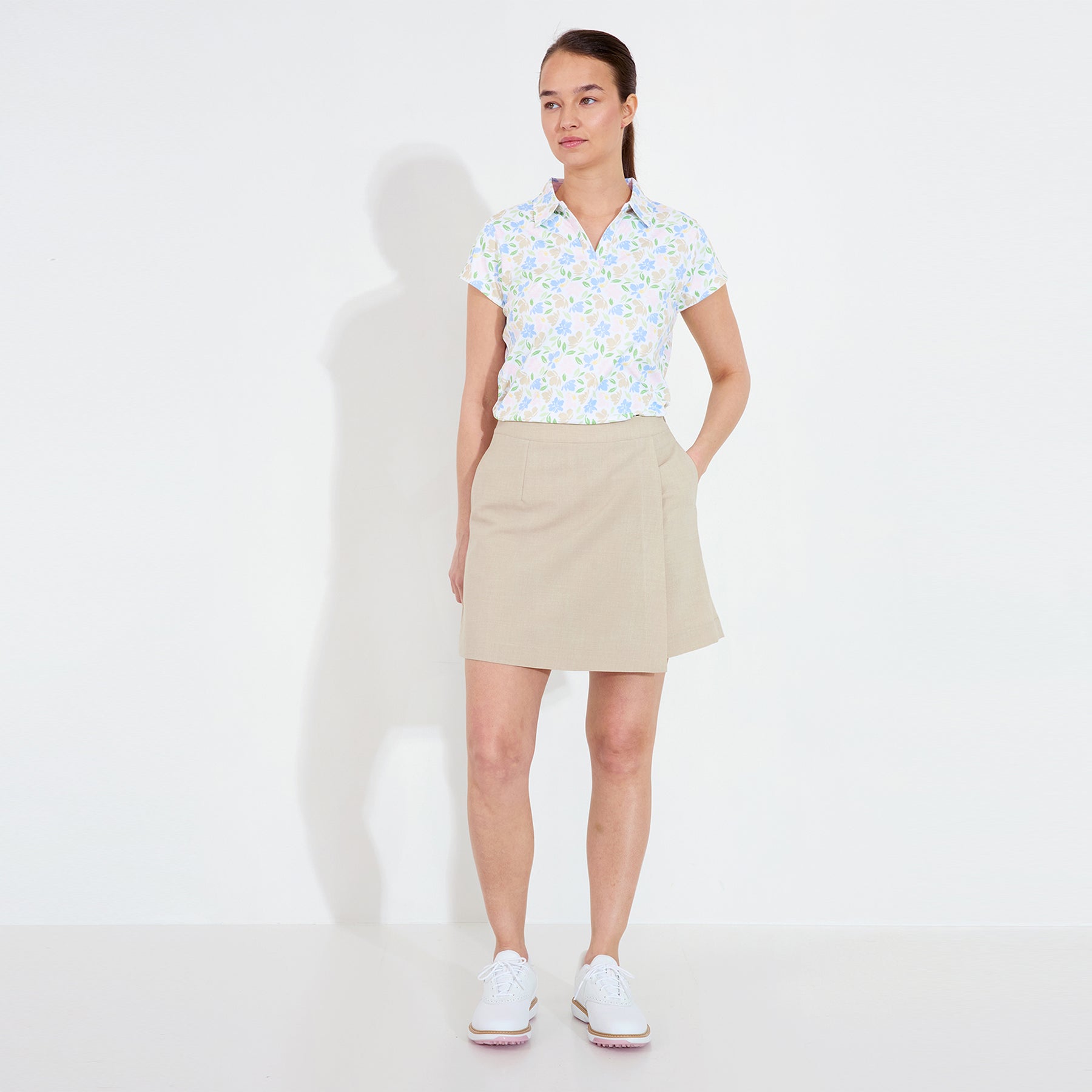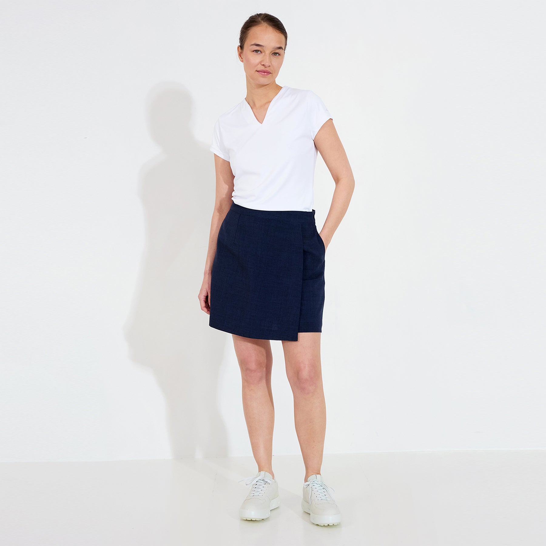 The Fortrose Skort combines the elegant appearance of a wrap-style skirt with the practical performance of technical golfwear. Crafted from a high-performance fabric that blends the airy feel of linen with stretch, moisture control, and all-day comfort, it moves effortlessly with you through every swing. The overlapping front panel creates the look of a classic skirt, while built-in shorts provide coverage and confidence. A discreet side zip ensures a smooth, streamlined silhouette, and functional side pockets add convenience without compromising style. Tailored, versatile, and designed for both the course and everyday wear, the Fortrose Skort is a stylish essential for the modern golfer.