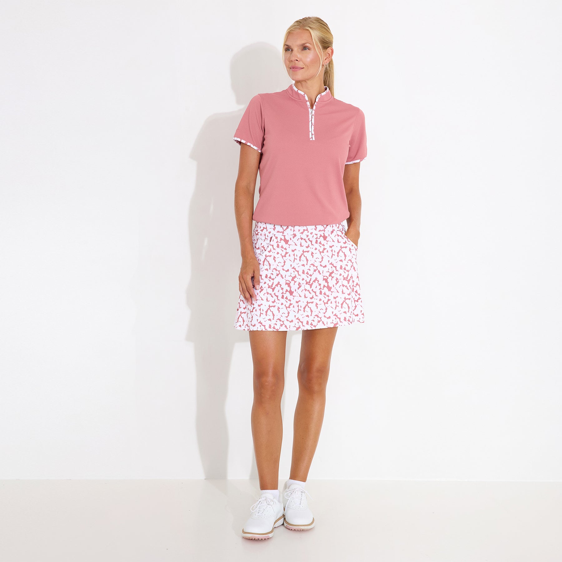 The Victoria Skort blends effortless comfort with graceful movement, making it a must-have for the modern golfer. Crafted from soft, stretchy fabric with DryCool technology and built-in UV protection, it keeps you comfortable, cool, and shielded from the sun throughout every round. Its flowy silhouette offers a light, airy feel, while color-matched inner shorts provide coverage and confidence. A generously sized zip pocket at the center back ensures secure storage for essentials. Combining feminine style with practical performance, this skort is designed to take you seamlessly from tee-off to the clubhouse.