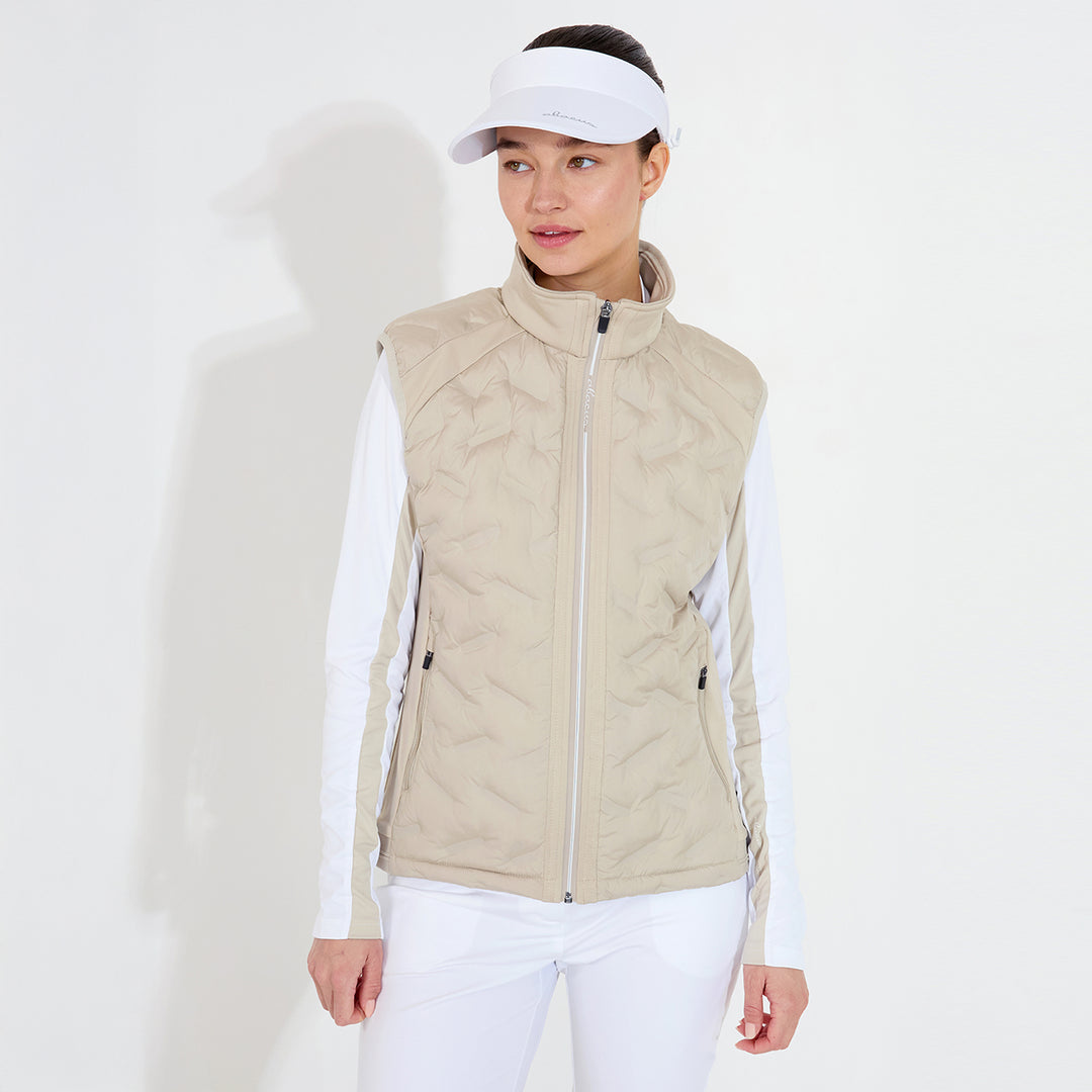 Our collection of women’s cold-weather golf gear includes women’s golf jackets, golf thermal vests and jackets, golf fleece pullovers, and other high-end pieces with added temperature regulation technology. Among our most popular selections in this line are the Grove Hybrid Jacket and vest, made of hot-pressed quilt in padded fabric that is completely windproof, yet breathable. The fact that the Grove is free from seams on the front and back of the jacket means that no wind passes through the fabric and you can happily enjoy windy rounds on the golf course without freezing.