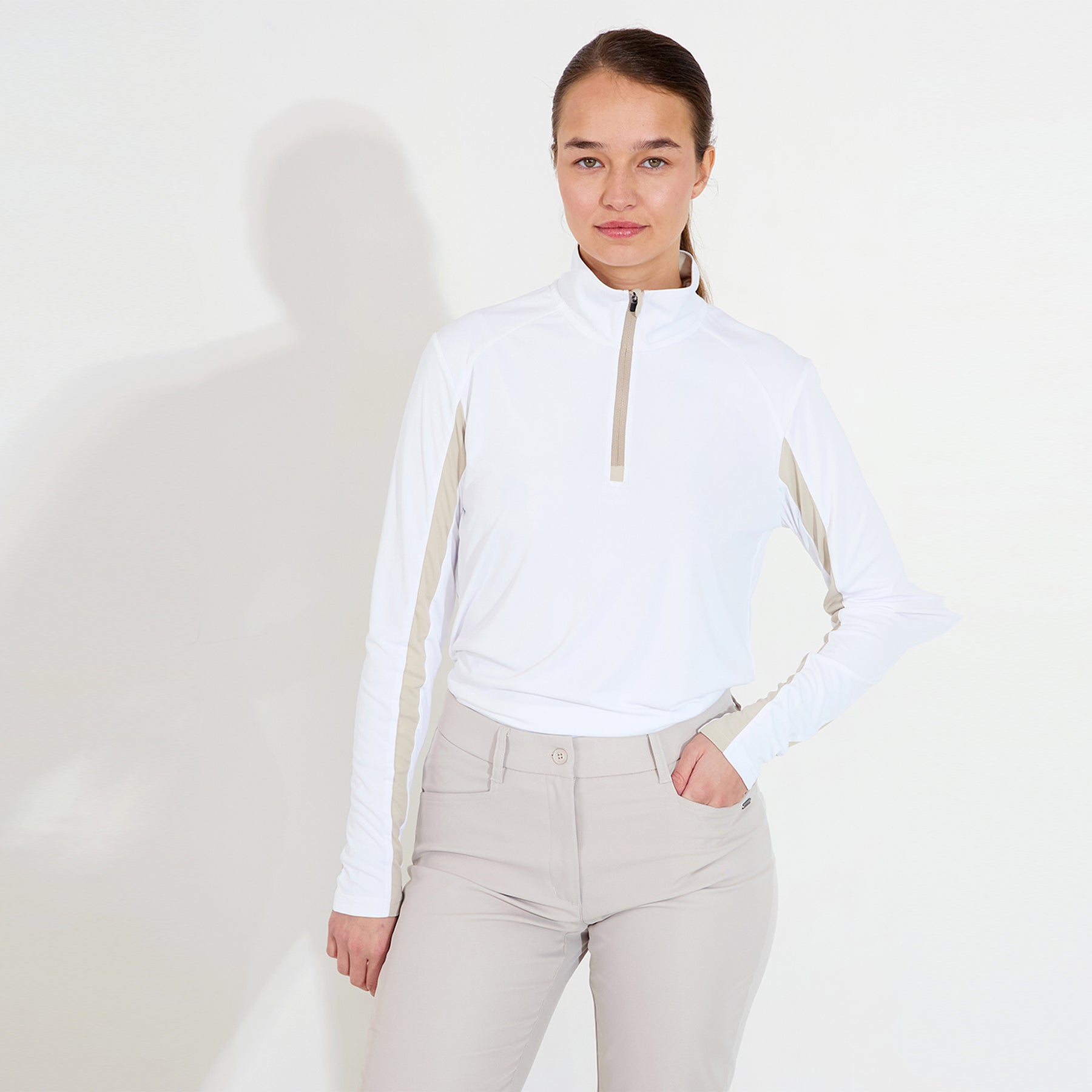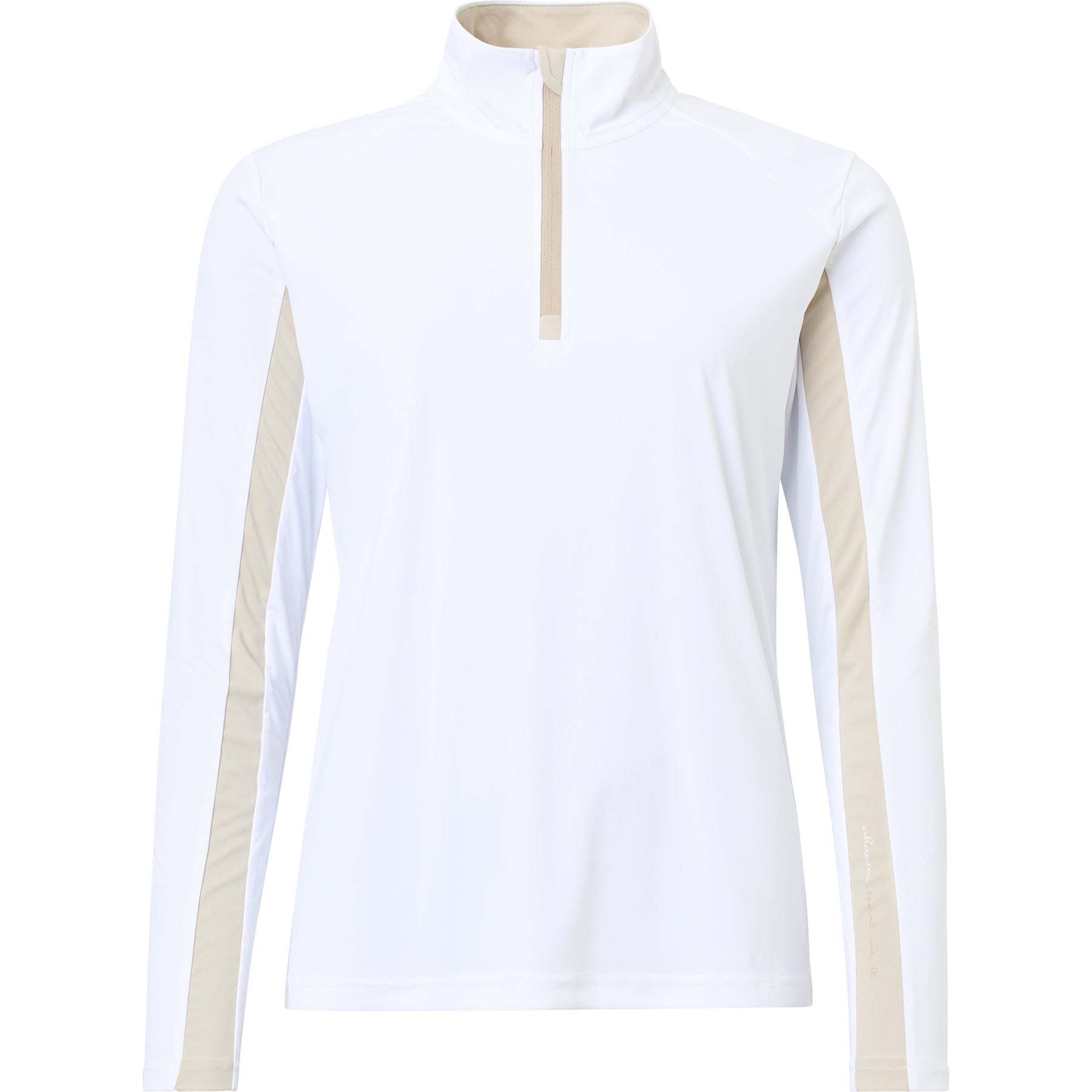 Aloha UV long sleeve is made of a thin and stretchy material that has UV-cut, DryCool and breathable functions. Zipper in neck, turtle neck collar, contrast stripe along  sleeve and across back. Abacus logo at left sleeve and center back neck below collar seam.