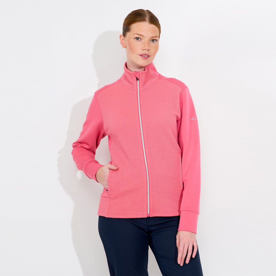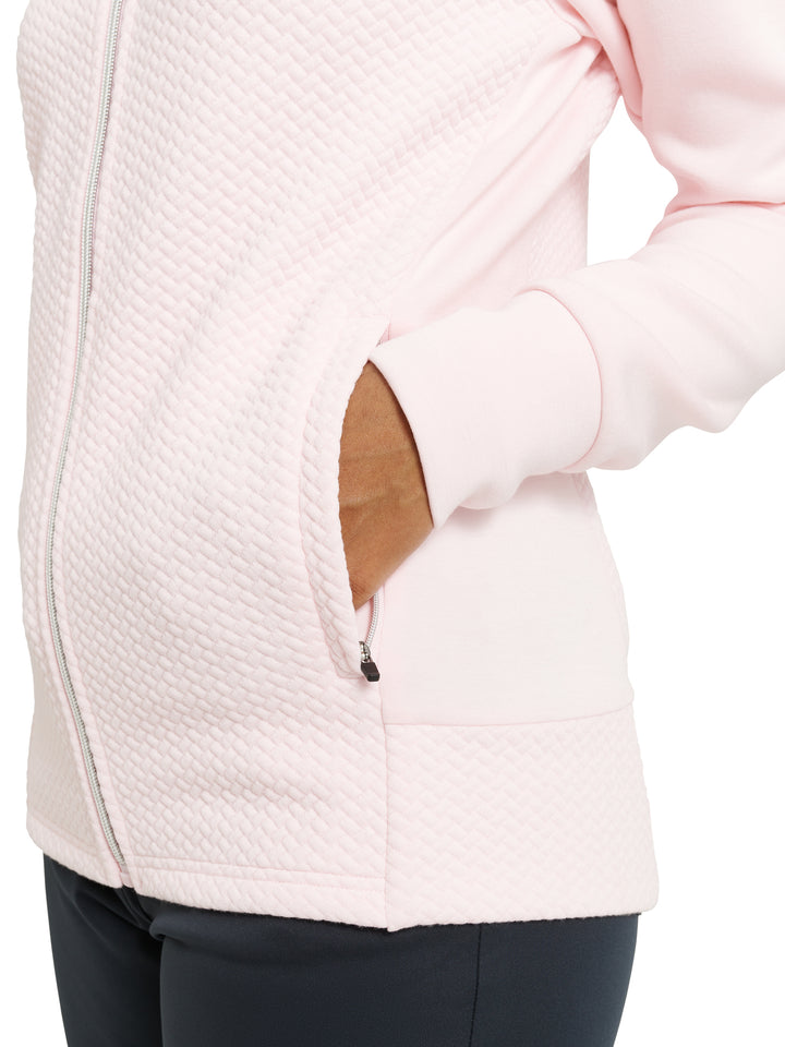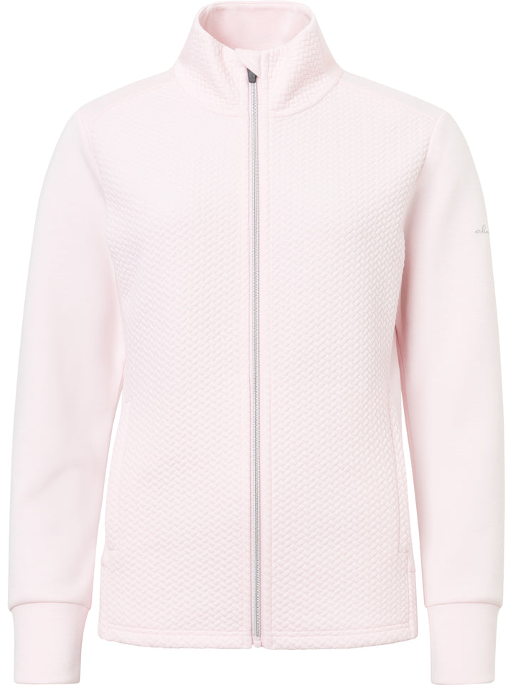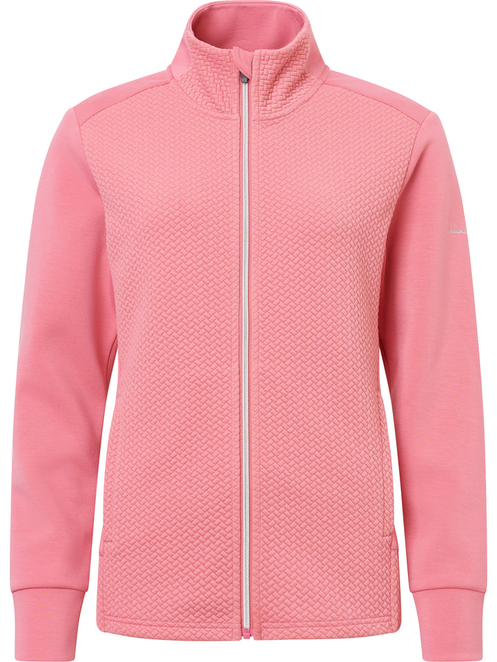 Carden jacket is a super soft full-zip midlayer with a feminine cut and somewhat longer in the body which is appreciated while active on the golf course. The jacket has a jacquard knitted pattern in main body and collar and flat knitted sides and arms. Its made of a stretchable fleece and provides extra warmth also in your everyday outfits thanks to its classic cut. The breathable fabric makes sure you stay comfortable also when you are physically active. Two side pockets with zippers.
