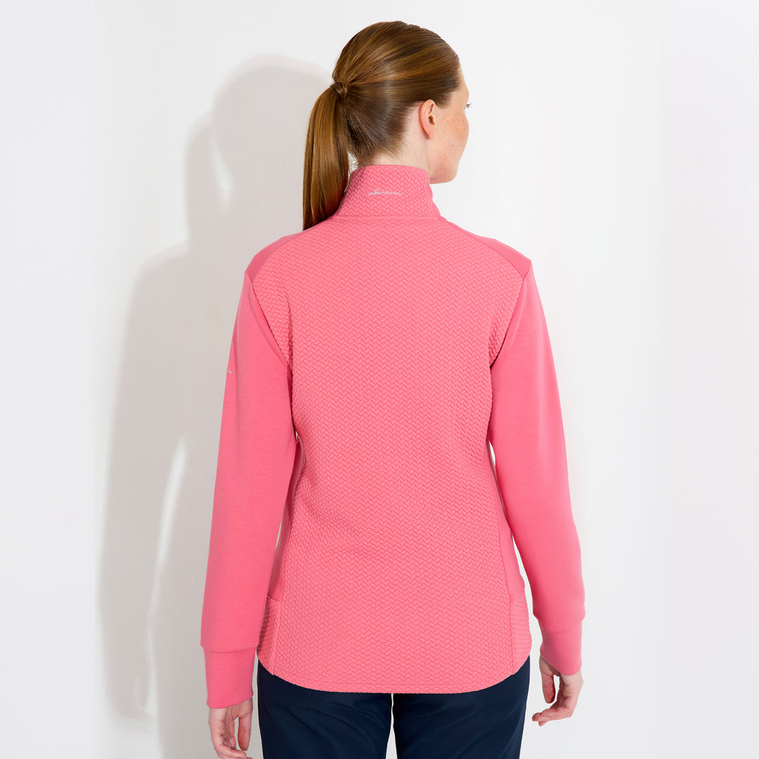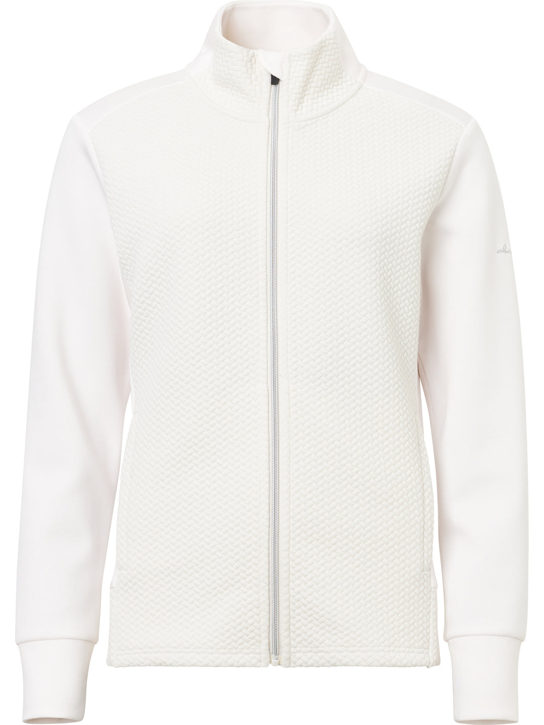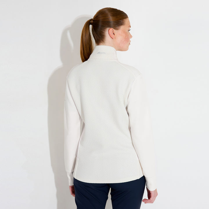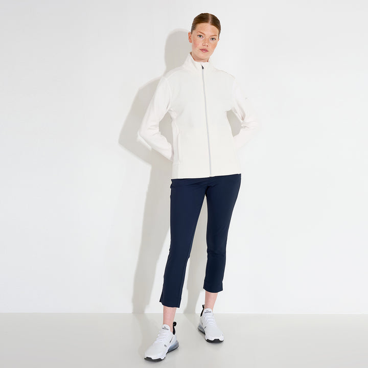 Carden jacket is a super soft full-zip midlayer with a feminine cut and somewhat longer in the body which is appreciated while active on the golf course. The jacket has a jacquard knitted pattern in main body and collar and flat knitted sides and arms. Its made of a stretchable fleece and provides extra warmth also in your everyday outfits thanks to its classic cut. The breathable fabric makes sure you stay comfortable also when you are physically active. Two side pockets with zippers.