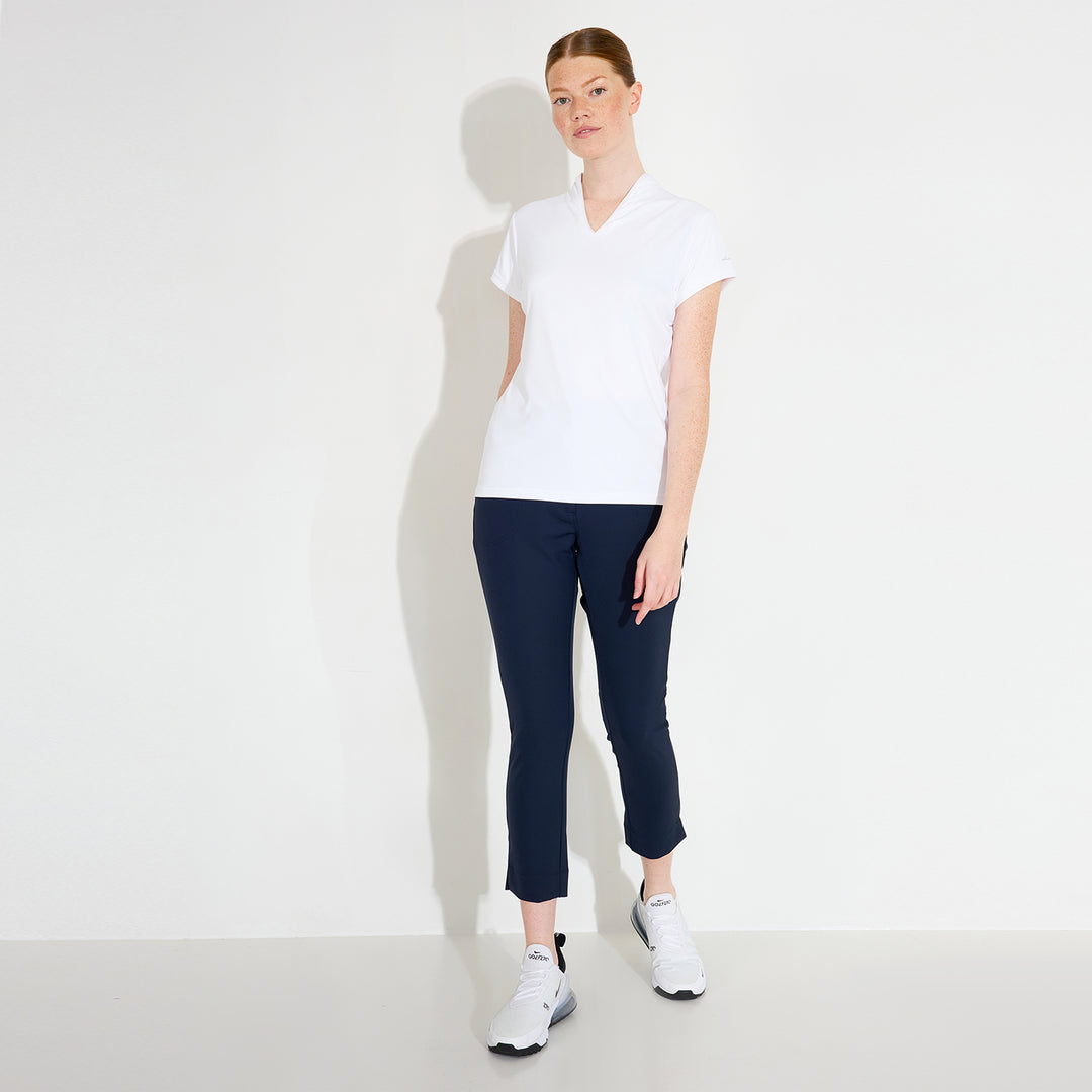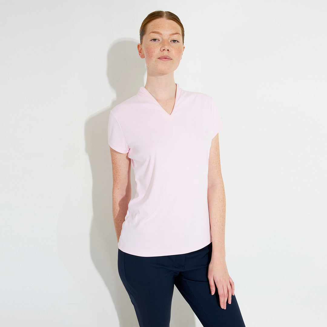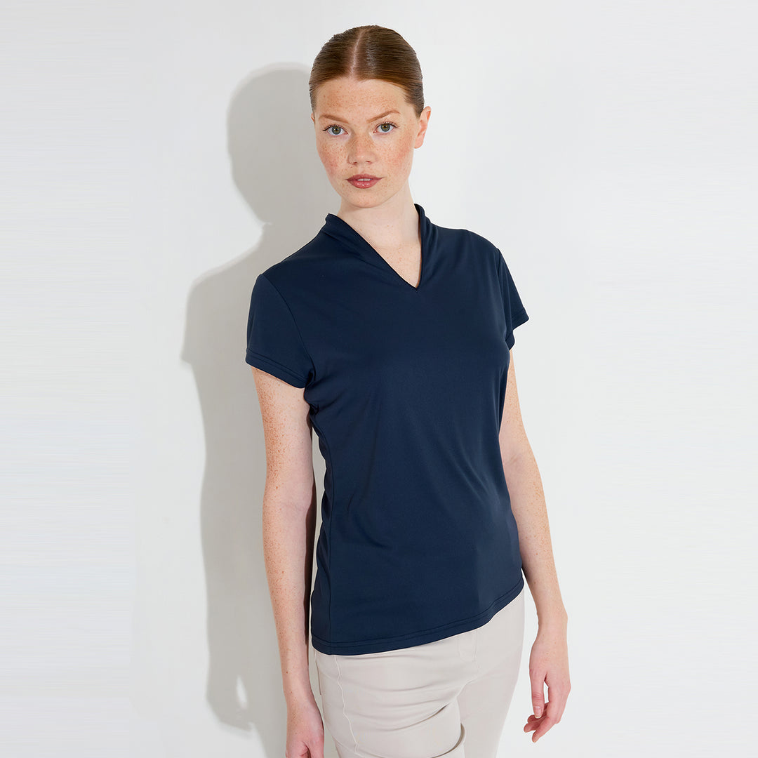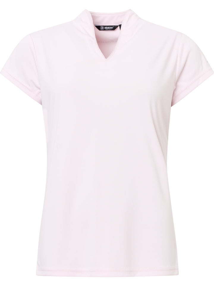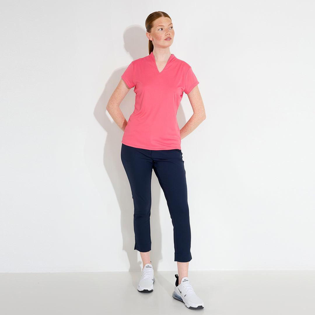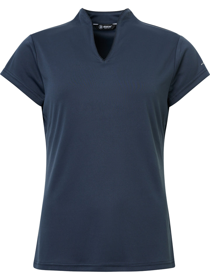 Hammel cupsleeve is made of soft and stretchy recycled polyester material. The top has DryCool properties and breathes very well. The V-neckline has a thin piping along the edge. Abacus logo on the back under the collar and on the left sleeve. This top is a dressy alternative to the regular pique with a collar.