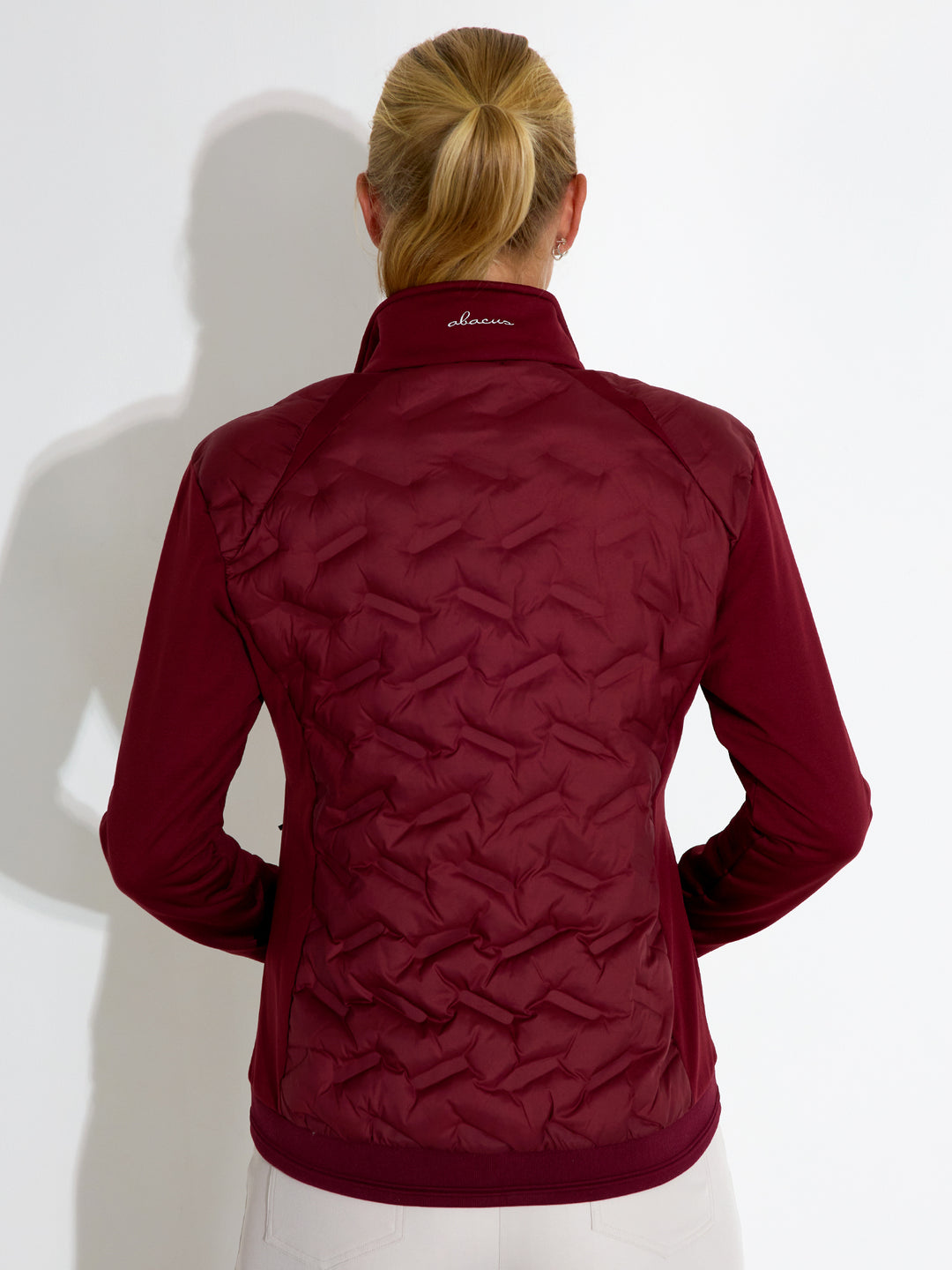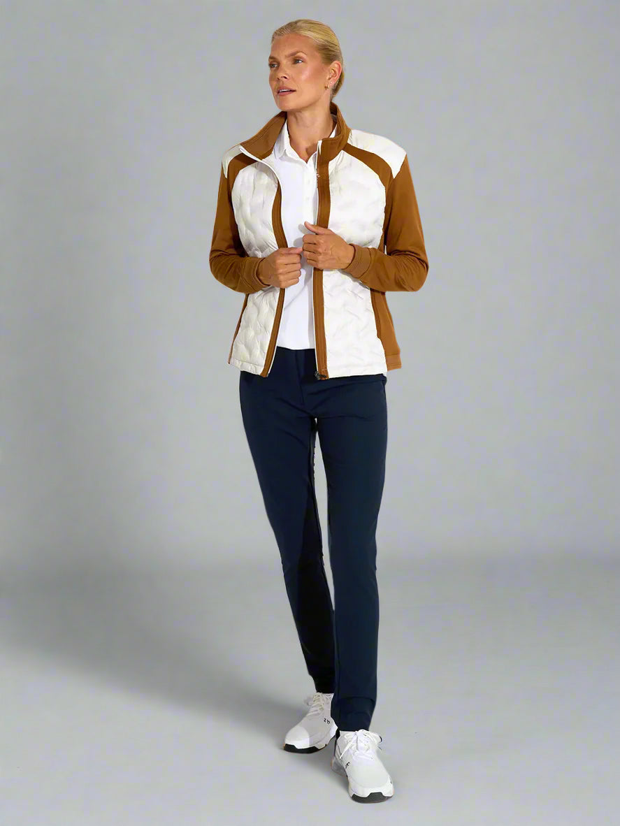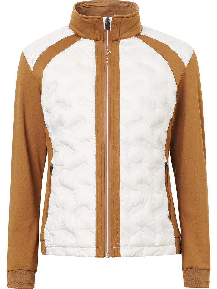 This innovative jacket features seamless quilted windproof fabric with strategic padding at the front and back to keep you warm while maintaining mobility. The side panels and shoulders are crafted from highly stretchable fleece, allowing unrestricted movement during your swing. The breathable fleece interior, particularly under the shoulders, ensures optimal temperature regulation and moisture management. Practical features include a full-front zipper and convenient side zip pockets. The versatile design combines windproof protection with stretchable comfort, making it perfect for various outdoor activities. Available in an array of sophisticated colors including Navy, Black, Cognac, and Cranberry, and sizes ranging from XS to XXL, this hybrid jacket adapts to your active lifestyle while maintaining a sleek, athletic silhouette. The 100% polyester construction delivers durability and easy care, while the specialized fabric technology provides protection against wind and light rain without compromising breathability.