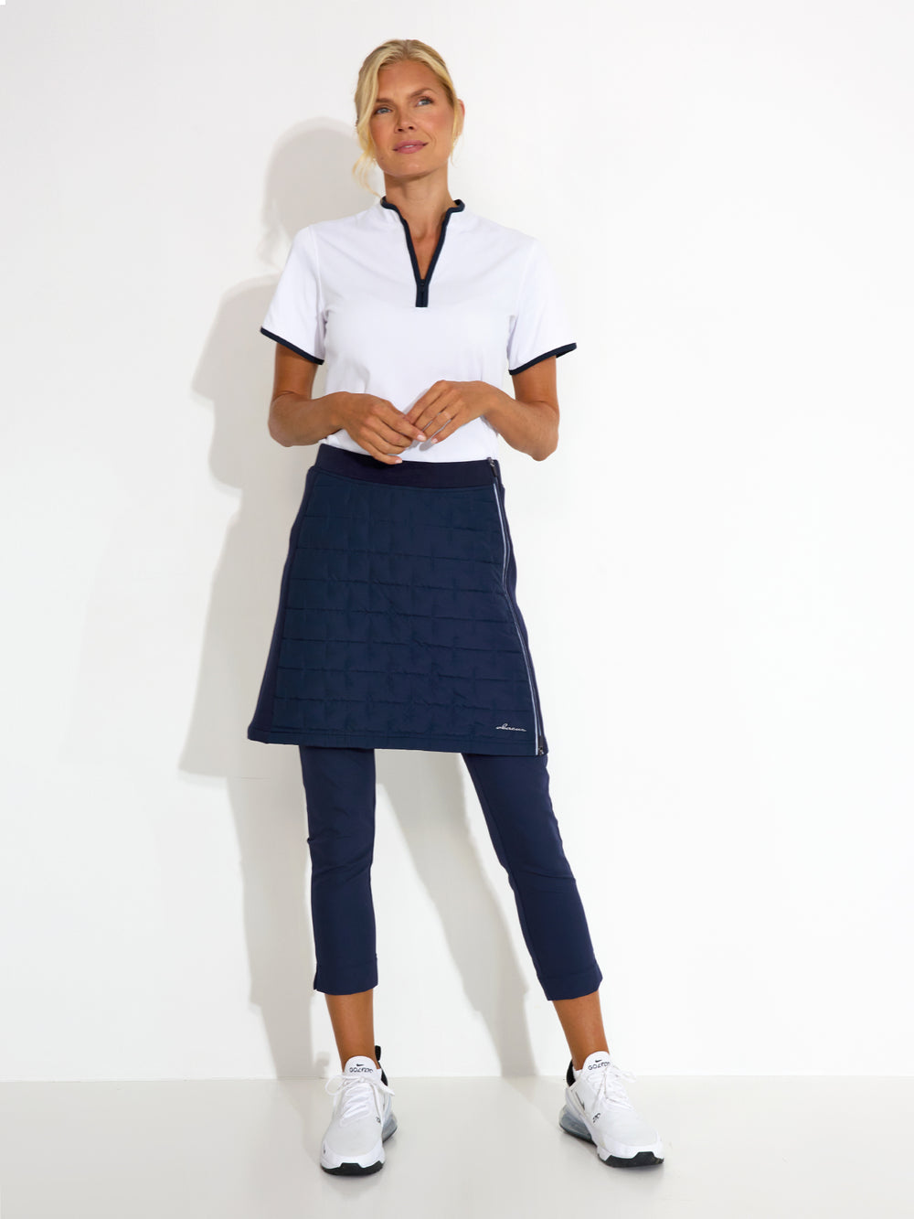 Stay warm and stylish on the golf course with the Vale skirt, the perfect extra layer for those chilly moments. This quilted and padded skirt is designed to slip easily over your regular trousers, providing added warmth when the temperature drops. A windproof and stylish garment to slip on when needed. The stretch panels at the sides ensure a comfortable, tailored fit, while the full-length 2-way zipper on the left side makes it easy to put on and take off. The iconic Abacus logo on the lower left front adds a touch of flair.